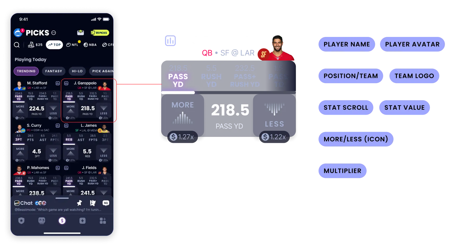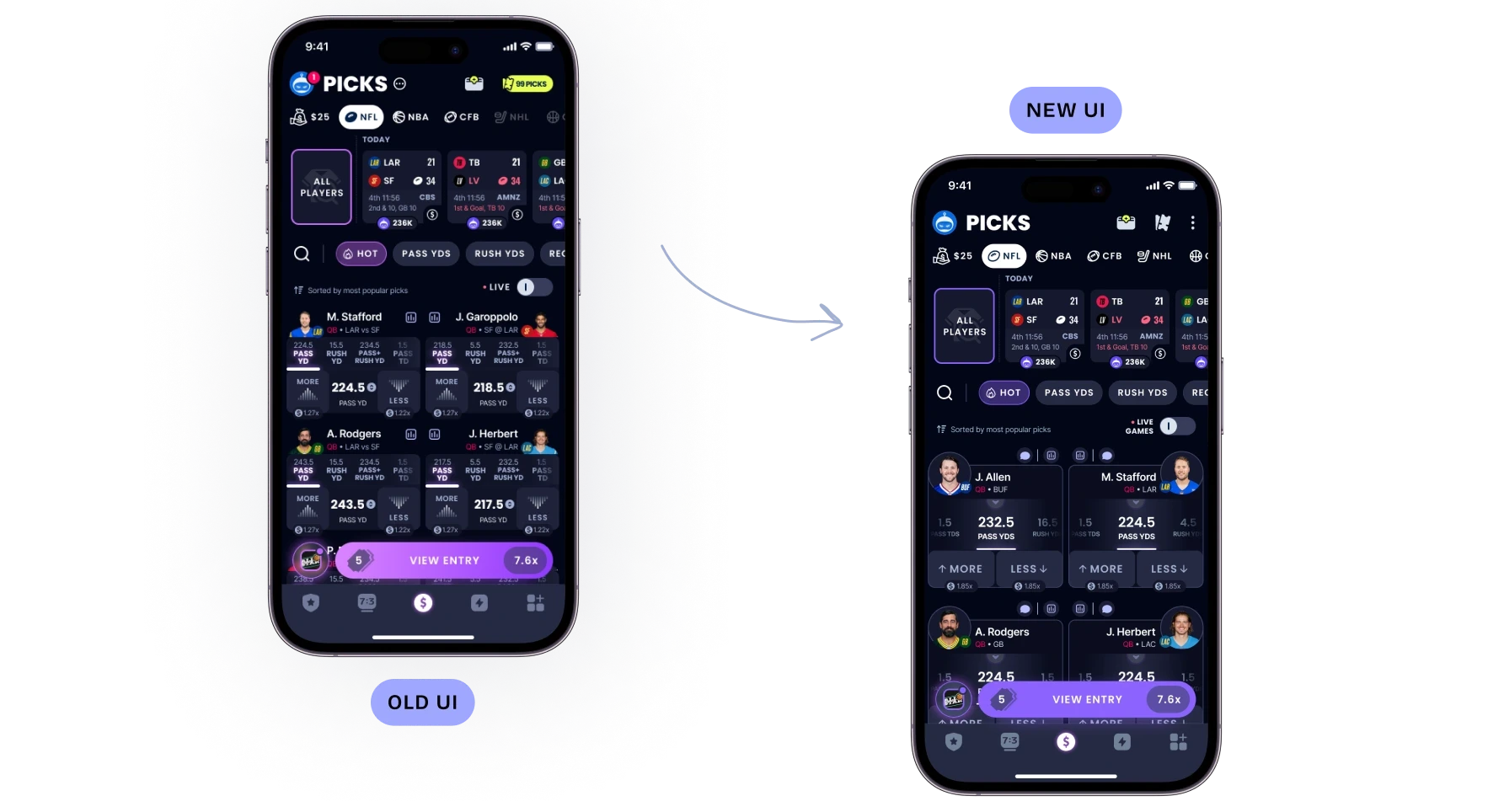The goal of this project was to enhance the user experience on the "Picks" screen of a popular fantasy sports app by reducing the information density within player cards. This wasn’t merely a cosmetic change—it required a nuanced approach to balance visual decluttering with the retention of essential interactive elements that drive user engagement.