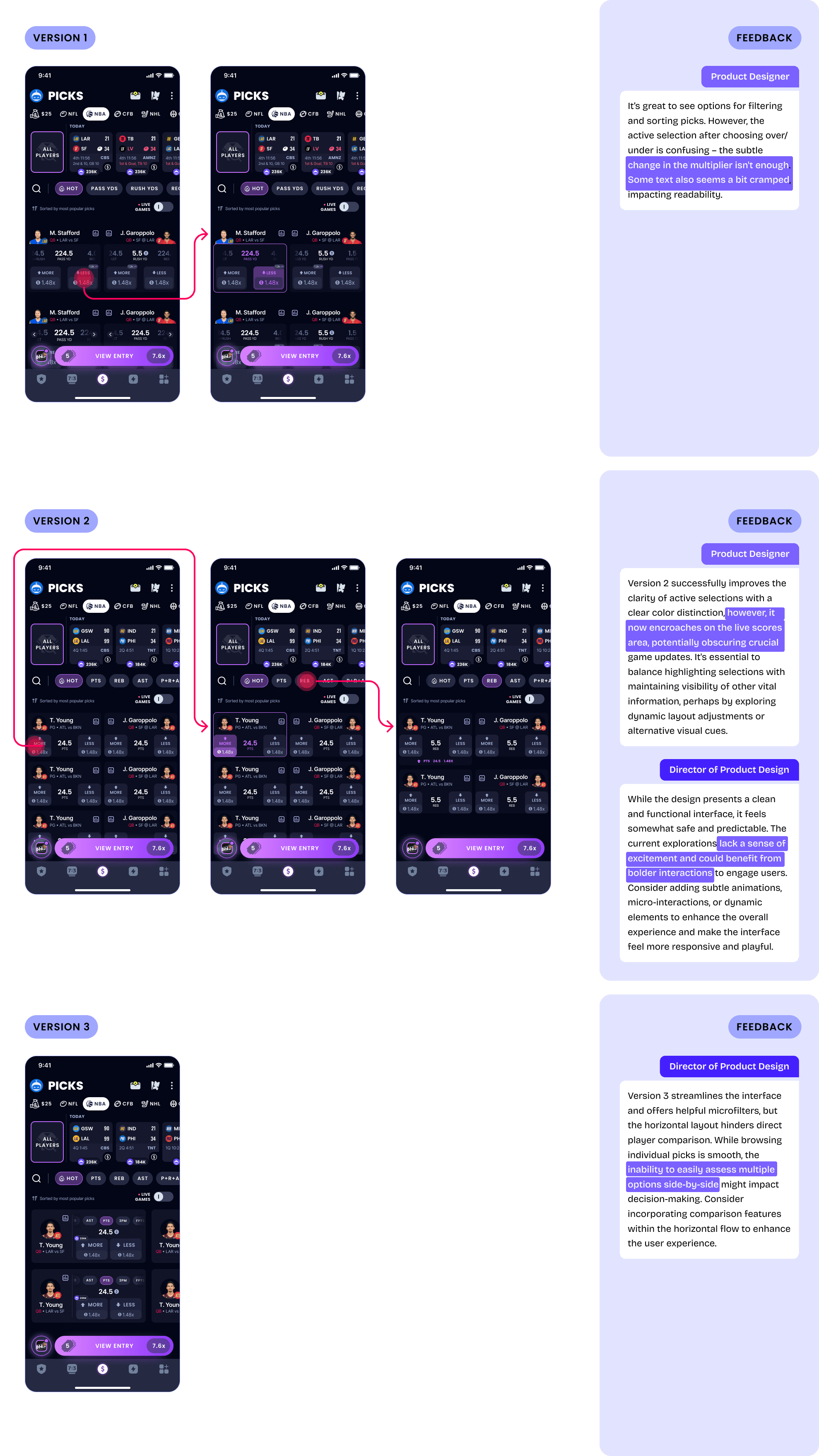 Before diving into any redesign efforts, it was crucial to thoroughly evaluate the existing design of the “Picks” screen. The current layout presented users with dense information packed into each player card, with multiple stats displayed in a compact manner. While the design aimed to provide comprehensive data at a glance, it also introduced a level of cognitive overload that could potentially hinder user experience.